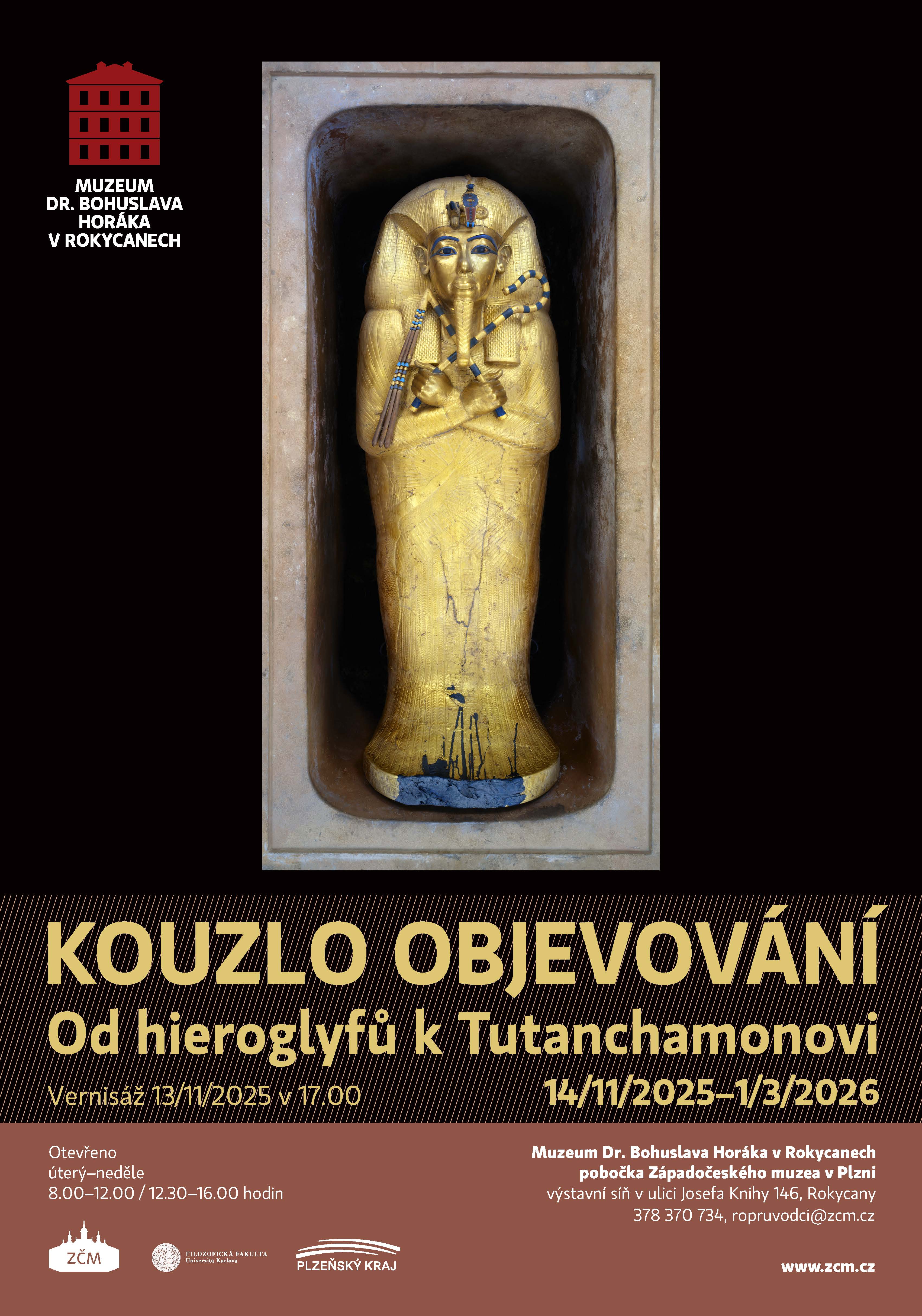 zve srdečně na výstavu Kouzlo objevování – Od hieroglyfů k Tutanchamonovi, která začíná vernisáží 13. listopadu 2025 od 16 hodin ve výstavní síni v ul. J. Knihy 146, Rokycany. Výstava potrvá do 1. března 2026.